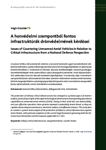 A katonai kritikus infrastruktúrák védelme a korszerű hadviselés egyik kulcskérdésévé vált, különös tekintettel a pilóta nélküli légi járművek (UAV) technológiai fejlődésére és alkalmazási körének bővülésére. E rendszerek kis méretük, alacsony észlelhetőségük, valamint gazdaságos üzemeltethetőségük révén potenciálisan súlyos fenyegetést jelentenek, mivel képesek felderítő, elektronikai zavaró és támadó műveletek végrehajtására. A tanulmány célja a honvédelmi szempontból fontos infrastruktúrák drónokkal szembeni védelmének rendszerszintű elemzése, különös hangsúlyt fektetve a jelenlegi jogszabályi környezetre mind a honvédelmi szempontból fontos infrastruktúrák, mind a drónvédelem vonatkozásában.