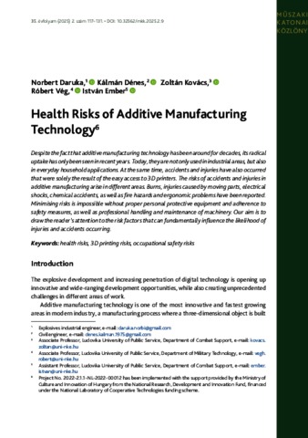 Daruka, Norbert and Dénes, Kálmán and Kovács, Zoltán Tibor and Vég, Róbert and Ember, István (2025) Health Risks of Additive Manufacturing Technology. MŰSZAKI KATONAI KÖZLÖNY, 35 (2). pp. 117-131. ISSN 1219-4166