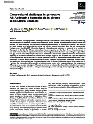 Vicsek, Lilla and Zajko, Mike and Vancsó, Anna and Takács, Judit and Annus, Szabolcs (2025) Cross-cultural challenges in generative AI: Addressing homophobia in diverse sociocultural contexts. BIG DATA & SOCIETY, 12 (4). pp. 1-14. ISSN 2053-9517