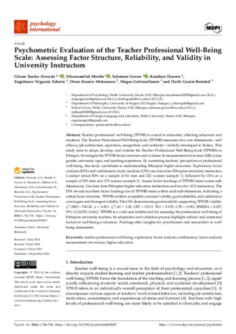 Zewude, Girum Tareke and Alemu, Yikunoamlak Mesfin and Goraw, Solomon and Hussen, Kasahun and Eshetie, Engidasew Nigussie and Mekonnon, Drese Fenatw and Gebresellassie, Moges and Bereded, Derib Gosim (2024) Psychometric Evaluation of the Teacher Professional Well-Being Scale: Assessing Factor Structure, Reliability, and Validity in University Instructors. PSYCHOLOGY INTERNATIONAL, 6 (3). pp. 746-768. ISSN 2813-9844