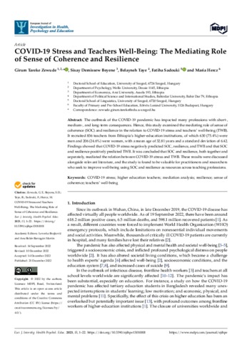 Zewude, Girum Tareke and Sisay, Demissew Beyene and Belayneh, Taye and Sadouki, Fatiha and Hercz, Mária (2023) COVID-19 Stress and Teachers Well-Being: The Mediating Role of Sense of Coherence and Resilience. EUROPEAN JOURNAL OF INVESTIGATION IN HEALTH PSYCHOLOGY AND EDUCATION, 13 (1). pp. 1-22. ISSN 2174-8144