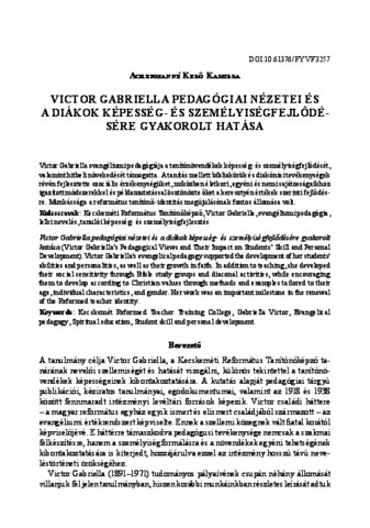Uncontrolled Keywords: Kecskemét Reformed Teacher Training College, Gabriella Victor, Evangelical pedagogy, Spiritual education, Student skill and personal development