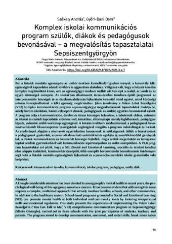 Székely, András and Győri-Dani, Dóra (2025) Komplex iskolai kommunikációs program szülők, diákok és pedagógusok bevonásával – a megvalósítás tapasztalatai Sepsiszentgyörgyön. KAPOCS, 8 (3-4). pp. 95-107. ISSN 1588-7227