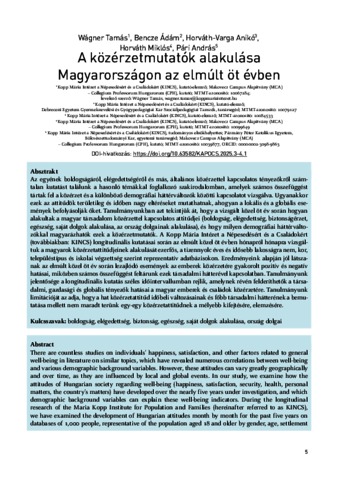 Az egyének boldogságáról, elégedettségéről és más, általános közérzettel kapcsolatos tényezőkről számtalan kutatást találunk a hasonló témákkal foglalkozó szakirodalomban, amelyek számos összefüggésttártak fel a közérzet és a különböző demográfiai háttérváltozók közötti kapcsolatot vizsgálva. Ugyanakkorezek az attitűdök területileg és időben nagy eltéréseket mutathatnak, ahogyan a lokális és a globális események befolyásolják őket. Tanulmányunkban azt tekintjük át, hogy a vizsgált közel öt év során hogyanalakultak a magyar társadalom közérzettel kapcsolatos attitűdjei (boldogság, elégedettség, biztonságérzet,egészség, saját dolgok alakulása, az ország dolgainak alakulása), és hogy milyen demográfiai háttérváltozókkal magyarázhatók ezek a közérzetmutatók. A Kopp Mária Intézet a Népesedésért és a Családokért(továbbiakban: KINCS) longitudinális kutatásai során az elmúlt közel öt évben hónapról hónapra vizsgáltuk a magyarok közérzetattitűdjeinek alakulását ezerfős, a tizennyolc éves és idősebb lakosságra nem, kor,településtípus és iskolai végzettség szerint reprezentatív adatbázisokon. Eredményeink alapján jól látszanak az elmúlt közel öt év során lezajlódó események az emberek közérzetére gyakorolt pozitív és negatívhatásai, miközben számos összefüggést feltárunk ezek társadalmi hátterével kapcsolatban. Tanulmányunkjelentősége a longitudinális kutatás széles időintervallumban rejlik, amelynek révén felderíthetők a társadalmi, gazdasági és globális tényezők hatásai a magyar emberek és családok közérzetére. Tanulmányunklimitációját az adja, hogy a hat közérzetattitűd időbeli változásainak és főbb társadalmi hátterének a bemutatása mellett nem maradt terünk egy-egy közérzetattitűdnek a mélyebb kifejtésére, elemzésére. | There are countless studies on individuals’ happiness, satisfaction, and other factors related to general well-being in literature on similar topics, which have revealed numerous correlations between well-being and various demographic background variables. However, these attitudes can vary greatly geographically and over time, as they are influenced by local and global events. In our study, we examine how the attitudes of Hungarian society regarding well-being (happiness, satisfaction, security, health, personal matters, the country’s matters) have developed over the nearly five years under investigation, and which demographic background variables can explain these well-being indicators. During the longitudinal research of the Maria Kopp Institute for Population and Families (hereinafter referred to as KINCS), we have examined the development of Hungarian attitudes month by month for the past five years on databases of 1,000 people, representative of the population aged 18 and older by gender, age, settlement type, and educational level. Our results clearly illustrate how events over the past five years have affected people’s well-being, both positively and negatively, and highlight several correlations with their social background. The significance of our study lies in the wide time interval of longitudinal research, which allows us to explore the effects of social, economic, and global factors on the well-being of Hungarian people and families. The limitation of our study is that, besides presenting the changes over time and the main social backgrounds of the six public sentiment attitudes, we did not have space for a deeper explanation and analysis of each public sentiment attitude.