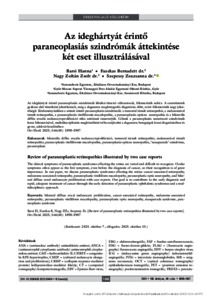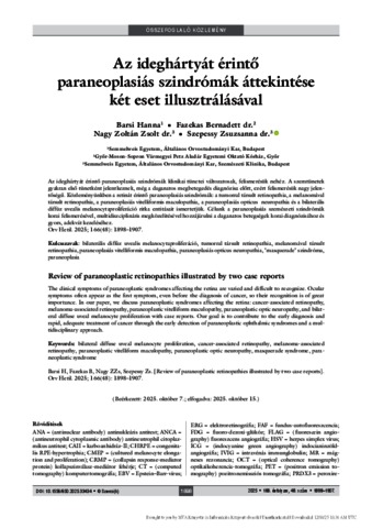 Az ideghártyát érintő paraneoplasiás szindrómák klinikai tünetei változatosak, felismerésük nehéz. A szemtünetek gyakran első tünetként jelentkeznek, még a daganatos megbetegedés diagnózisa előtt, ezért felismerésük nagy jelentőségű. Közleményünkben a retinát érintő paraneoplasiás szindrómák: a tumorral társult retinopathia, a melanomával társult retinopathia, a paraneoplasiás vitelliformis maculopathia, a paraneoplasiás opticus neuropathia és a bilaterális diffúz uvealis melanocytaproliferáció ritka entitásait ismertetjük. Célunk a paraneoplasiás szemészeti szindrómák korai felismerésével, multidiszciplináris megközelítésével hozzájárulni a daganatos betegségek korai diagnózisához és gyors, adekvát kezeléséhez. Orv Hetil. 2025; 166(48): 1898–1907. | The clinical symptoms of paraneoplastic syndromes affecting the retina are varied and difficult to recognize. Ocular symptoms often appear as the first symptom, even before the diagnosis of cancer, so their recognition is of great importance. In our paper, we discuss paraneoplastic syndromes affecting the retina: cancer-associated retinopathy, melanoma-associated retinopathy, paraneoplastic vitelliform maculopathy, paraneoplastic optic neuropathy, and bilat- eral diffuse uveal melanocyte proliferation with case reports. Our goal is to contribute to the early diagnosis and rapid, adequate treatment of cancer through the early detection of paraneoplastic ophthalmic syndromes and a mul- tidisciplinary approach.