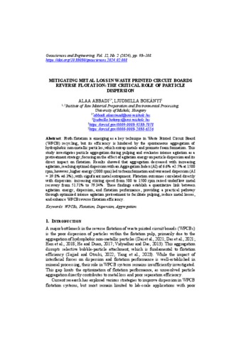 Abbadi, Alaa and Bokányi, Ljudmilla (2025) Mitigating metal loss in waste printed circuit boards reverse flotation: The critical role of particle dispersion. GEOSCIENCES AND ENGINEERING: A PUBLICATION OF THE UNIVERSITY OF MISKOLC, 12 (2). pp. 93-108. ISSN 2063-6997