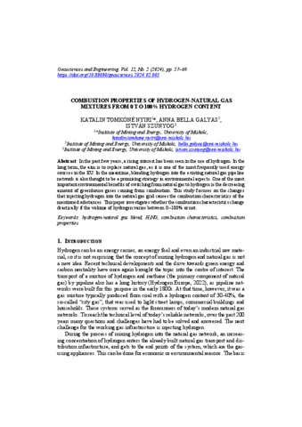 Tomkóné Nyiri, Katalin and Galyas, Anna Bella and Szunyog, István (2025) Combustion properties of hydrogen-natural gas mixtures from 0 to 100 % hydrogen content. GEOSCIENCES AND ENGINEERING: A PUBLICATION OF THE UNIVERSITY OF MISKOLC, 12 (2). pp. 57-69. ISSN 2063-6997