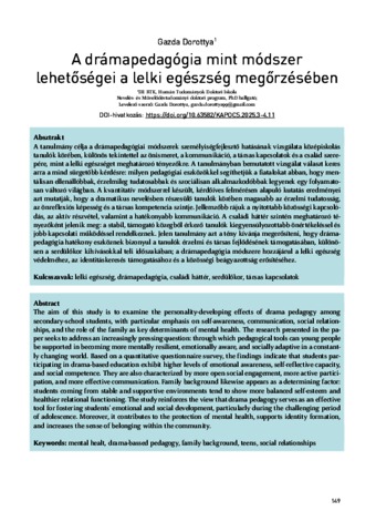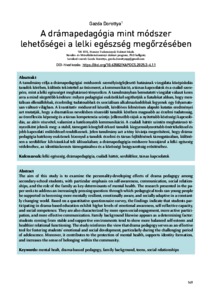 A tanulmány célja a drámapedagógiai módszerek személyiségfejlesztő hatásának vizsgálata középiskolástanulók körében, különös tekintettel az önismeret, a kommunikáció, a társas kapcsolatok és a család szerepére, mint a lelki egészséget meghatározó tényezőkre. A tanulmányban bemutatott vizsgálat választ keresarra a mind sürgetőbb kérdésre: milyen pedagógiai eszközökkel segíthetjük a fiatalokat abban, hogy mentálisan ellenállóbbak, érzelmileg tudatosabbak és szociálisan alkalmazkodóbbak legyenek egy folyamatosan változó világban. A kvantitatív módszerrel készült, kérdőíves felmérésen alapuló kutatás eredményeiazt mutatják, hogy a dramatikus nevelésben részesülő tanulók körében magasabb az érzelmi tudatosság,az önreflexiós képesség és a társas kompetencia szintje. Jellemzőbb rájuk a nyitottabb közösségi kapcsolódás, az aktív részvétel, valamint a hatékonyabb kommunikáció. A családi háttér szintén meghatározó tényezőként jelenik meg: a stabil, támogató közegből érkező tanulók kiegyensúlyozottabb önértékeléssel ésjobb kapcsolati működéssel rendelkeznek. Jelen tanulmány azt a tény kívánja megerősíteni, hogy drámapedagógia hatékony eszköznek bizonyul a tanulók érzelmi és társas fejlődésének támogatásában, különösen a serdülőkor kihívásokkal teli időszakában; a drámapedagógia módszere hozzájárul a lelki egészségvédelméhez, az identitáskeresés támogatásához és a közösségi beágyazottság erősítéséhez. | The aim of this study is to examine the personality-developing effects of drama pedagogy among secondary-school students, with particular emphasis on self-awareness, communication, social relationships, and the role of the family as key determinants of mental health. The research presented in the paper seeks to address an increasingly pressing question: through which pedagogical tools can young people be supported in becoming more mentally resilient, emotionally aware, and socially adaptive in a constantly changing world. Based on a quantitative questionnaire survey, the findings indicate that students participating in drama-based education exhibit higher levels of emotional awareness, self-reflective capacity, and social competence. They are also characterized by more open social engagement, more active participation, and more effective communication. Family background likewise appears as a determining factor: students coming from stable and supportive environments tend to show more balanced self-esteem and healthier relational functioning. The study reinforces the view that drama pedagogy serves as an effective tool for fostering students’ emotional and social development, particularly during the challenging period of adolescence. Moreover, it contributes to the protection of mental health, supports identity formation, and increases the sense of belonging within the community.