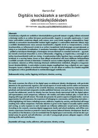 A tanulmány a digitális tér serdülőkori identitásfejlődésre gyakorolt hatásait vizsgálja, különös tekintettela közösségi média és az online környezet pszichoszociális, kognitív és szexuális aspektusaira. A tanulmány szakirodalmi szintézisen alapul, mely számos 2010–2025 között megjelent metaanalitikus, longitudinális és nemzetközi összehasonlító kutatást foglal magában. A szakirodalmi áttekintés feltárja, hogya serdülők identitáskeresése mára szorosan összefonódik a digitális térrel: az önreprezentáció, a társasösszehasonlítás, az influenszerek mintái és az online visszajelzések kulcsfontosságú szerepet játszanak azénkép és az önértékelés formálásában. A tanulmány bemutatja a digitális média pozitív vonatkozásait is– például az önkifejezés lehetőségét, a közösséghez tartozás élményét és a tanulási motivációt –, ugyanakkor kiemeli a kockázati tényezőket is, mint a túlhasználat, a függőség, az impulzivitás, a szorongás és azonline összehasonlításból eredő torz önkép. A tanulmányban külön figyelmet kap a szexuálisan explicittartalmak és a szexting hatása, hiszen az ilyen jellegű tartalmakkal való korai találkozás befolyásolhatjaa serdülők szexuális normáit és identitását. A kutatások szerint a tudatos digitális jelenlét, a családi és iskolai mediáció, valamint az offline közösségi élmények védőfaktorként működnek, elősegítve a kiegyensúlyozott identitásfejlődést. A szakirodalmi szintézis alapján megállapítható, hogy a digitális tér nem csupánfenyegetés, hanem a fejlődés és önreflexió lehetősége is, de csak abban az esetben, ha a fiatalok megfelelőtámogatással, kritikai gondolkodással és médiatudatossággal rendelkeznek. | The study examines the effects of the digital space on adolescent identity development, with particular attention to the psychosocial, cognitive, and sexual aspects of social media and the online environment. The study is based on a synthesis of the scientific literature, encompassing numerous meta-analytic, longitudinal, and international comparative studies published between 2010 and 2025. The literature review reveals that adolescents’ search for identity has now become closely intertwined with the digital sphere: self-representation, social comparison, influencer role models, and online feedback play a crucial role in shaping self-image and self-esteem. The study also presents the positive aspects of digital media—such as opportunities for self-expression, the experience of belonging to a community, and learning motivation— while highlighting risk factors including overuse, addiction, impulsivity, anxiety, and distorted self-image resulting from online comparison. Particular attention is given to the impact of sexually explicit content and sexting, as early exposure to such material can influence adolescents’ sexual norms and identity. According to the research, conscious digital engagement, family and school mediation, and offline community experiences function as protective factors that promote balanced identity development. Based on the synthesis of the literature, it can be concluded that the digital space is not merely a threat but also a potential arena for growth and self-reflection—yet only if young people possess adequate support, critical thinking skills, and media literacy.