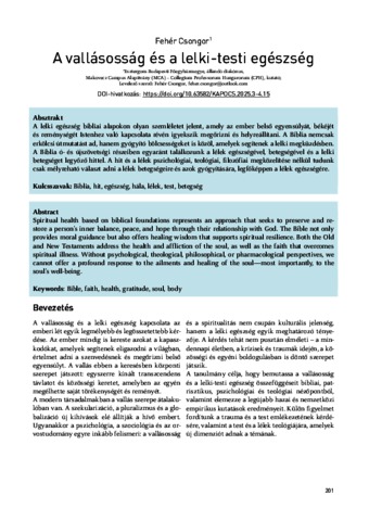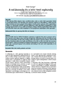 A lelki egészség bibliai alapokon olyan szemléletet jelent, amely az ember belső egyensúlyát, békéjét és reménységét Istenhez való kapcsolata révén igyekszik megőrizni és helyreállítani. A Biblia nem csak erkölcsi útmutatást ad, hanem gyógyító bölcsességeket is közöl, amelyek segítenek a lelki megküzdésben.A Biblia ó- és újszövetségi részeiben egyaránt találkozunk a lélek egészségével, betegségével és a lelkibetegséget legyőző hittel. A hit és a lélek pszichológiai, teológiai, filozófiai megközelítése nélkül tudunk csak mélyreható választ adni a lélek betegségeire és azok gyógyítására, legfőképpen a lélek egészségére. | Spiritual health based on biblical foundations represents an approach that seeks to preserve and restore a person’s inner balance, peace, and hope through their relationship with God. The Bible not only provides moral guidance but also offers healing wisdom that supports spiritual resilience. Both the Old and New Testaments address the health and affliction of the soul, as well as the faith that overcomes spiritual illness. Without psychological, theological, philosophical, or pharmacological perspectives, we cannot offer a profound response to the ailments and healing of the soul—most importantly, to the soul’s well-being.