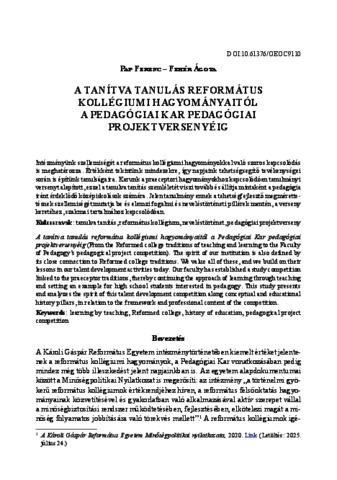 Pap, Ferenc and Fehér, Ágota (2025) A tanítva tanulás református kollégiumi hagyományaitól a Pedagógiai Kar pedagógiai projektversenyéig = From the Reformed college traditions of teaching and learning to the Faculty of Pedagogy’s pedagogical project competition. In: Központban a tehetség. Károli Gáspár Református Egyetem Pedagógiai Kar, Nagykőrös, pp. 31-44.