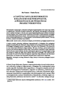 Intézményünk szellemiségét a református kollégiumi hagyományokkal való szoros kapcsolódás is meghatározza. Értékként tekintünk mindezekre, így napjaink tehetségsegítő tevékenységei során is építünk tanulságaira. Karunk a praeceptori hagyományokhoz kapcsolódóan tanulmányi versenyt alapított, ezzel a tanulva tanítás szemléletét viszi tovább és állítja mintaként a pedagógia iránt érdeklődő középiskolások számára. Jelen tanulmány ennek a tehetségfejlesztő megmérettetésnek szellemiségét mutatja be és elemzi fogalmi és neveléstörténeti pillérek mentén, a verseny keretéhez, szakmai tartalmához kapcsolódóan. | The spirit of our institution is also defined by its close connection to Reformed college traditions. We value all of these, and we build on their lessons in our talent development activities today. Our faculty has established a study competition linked to the praeceptor traditions, thereby continuing the approach of learning through teaching and setting an example for high school students interested in pedagogy. This study presents and analyzes the spirit of this talent development competition along conceptual and educational history pillars, in relation to the framework and professional content of the competition.