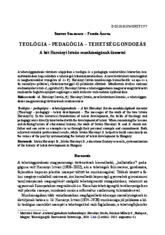 A tehetséggondozás történeti alapjaiban a teológia és a pedagógia szakterületei közvetlen ös - szefonódásban kapcsolódtak a tehetségek kibontakoztatásához. A neveléstörténeti tanulságokat és meghatározókat vizsgálva id. és ifj. Harsányi István munkássága kiemelkedik: az apa és a fia személyes példával, elkötelezettséggel áll példaként előttünk. Mindketten értékes szakmai eredményeket értek el, egyúttal ifj. Harsányi István a tehetséggondozás magyarországi történetét rendszerbe foglalva nyújtott segítséget a múlt értékeire való tudatos építkezéshez. | In the historical foundations of talent development, the fields of theology and pedagogy were directly intertwined with the development of talent. When examining the lessons and defining factors of educational history, the work of István Harsányi Sr. and Jr. stands out: father and son serve as examples to us through their personal example and commitment. Both achieved valuable professional results, while István Harsányi Jr. helped to build consciously on the values of the past by systematizing the history of talent development in Hungary.