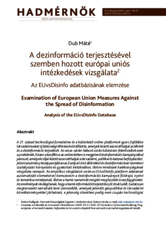 Dub, Máté (2025) A dezinformáció terjesztésével szemben hozott európai uniós intézkedések vizsgálata : Az EUvsDisinfo adatbázisának elemzése = Examination of European Union Measures Against the Spread of Disinformation : Analysis of the EUvsDisinfo Database. HADMÉRNÖK, 20 (1). pp. 49-72. ISSN 1788-1919