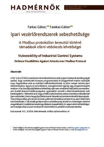 Farkas, Gábor and Fazekas, Gábor (2025) Ipari vezérlőrendszerek sebezhetősége : A Modbus protokollon keresztül történő támadások elleni védekezés lehetőségei = Vulnerability of Industrial Control Systems : Defence Possibilities Against Attacks over Modbus Protocol. HADMÉRNÖK, 20 (1). pp. 73-85. ISSN 1788-1919