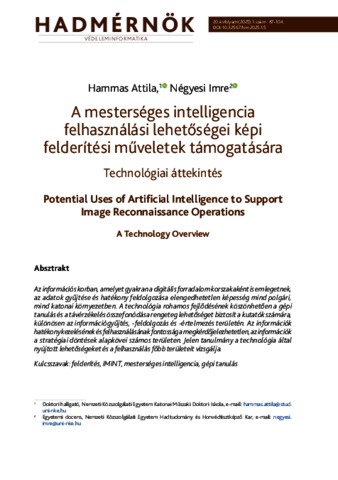 Az információs korban, amelyet gyakran a digitális forradalom korszakaként is emlegetnek, az adatok gyűjtése és hatékony feldolgozása elengedhetetlen képesség mind polgári, mind katonai környezetben. A technológia rohamos fejlődésének köszönhetően a gépi tanulás és a távérzékelés összefonódása rengeteg lehetőséget biztosít a kutatók számára, különösen az információgyűjtés, -feldolgozás és -értelmezés területén. Az információk hatékony kezelésének és felhasználásának fontossága megkérdőjelezhetetlen, az információk a stratégiai döntések alapkövei számos területen. Jelen tanulmány a technológia által nyújtott lehetőségeket és a felhasználás főbb területeit vizsgálja. | In the information age, often referred to as the era of the digital revolution, the collection and the processing of data is an essential capability in both civilian and military environments. Thanks to the rapid development of technology, the intertwining of machine learning and remote sensing provides us with many opportunities, especially in the areas of information collection, processing and interpretation. The importance of effective management and use of information is unquestionable - information is the cornerstone of strategic decisions in many areas. The article will examine the opportunities provided by technology.