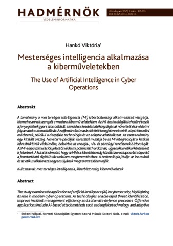 A tanulmány a mesterséges intelligencia (MI) kiberbiztonsági alkalmazásait vizsgálja, kiemelve annak szerepét a modern kiberműveletekben. Az MI-technológiák lehetővé teszik a fenyegetések gyors azonosítását, az incidenskezelés hatékonyságának növelését és a védelmi folyamatok automatizálását. Az offenzív alkalmazások között megjelennek az MI-alapú támadási módszerek, például a deepfake technológia és az adaptív adathalászat. Az esettanulmány egy kitalált ország, Novaterra példáján keresztül mutatja be az MI integrációját a kritikus infrastruktúrák védelmébe, beleértve az energia-, víz- és pénzügyi rendszerek biztonságát. Az MI-alapú szimulációk jelentős védelmi potenciált hordoznak, ugyanakkor etikai kérdéseket is felvetnek. A kutatás rámutat, hogy az MI és a kiberbiztonság közötti szoros kapcsolat alapvető a fenntartható digitális társadalom megteremtéséhez. A technológia jövője az innováció és az etikus alkalmazás egyensúlyának megteremtésében rejlik. | The study examines the applications of artificial intelligence (AI) in cybersecurity, highlighting its role in modern cyber operations. AI technologies enable rapid threat identification, improve incident management efficiency and automate defence processes. Offensive applications include AI-based attack methods such as deepfake technology and adaptive phishing. The case study uses the example of a fictional country, Novaterra, to illustrate the integration of AI into the protection of critical infrastructure, including energy, water and financial systems. AI-based simulations have significant defence potential but also raise ethical issues. The research shows that the close link between AI and cybersecurity is essential for creating a sustainable digital society. The future of the technology lies in balancing innovation and ethical application.