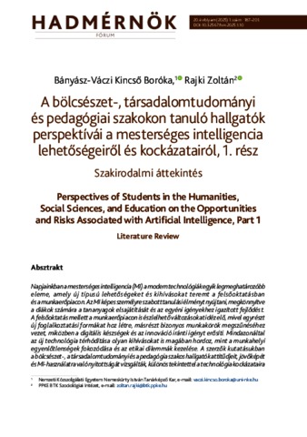 Bányász-Váczi, Kincső Boróka and Rajki, Zoltán (2025) A bölcsészet-, társadalomtudományi és pedagógiai szakokon tanuló hallgatók perspektívái a mesterséges intelligencia lehetőségeiről és kockázatairól, 1. rész : Szakirodalmi áttekintés = Perspectives of Students in the Humanities, Social Sciences, and Education on the Opportunities and Risks Associated with Artificial Intelligence, Part 1. HADMÉRNÖK, 20 (1). pp. 187-201. ISSN 1788-1919
