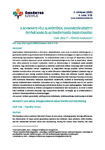 Szakirodalomi áttekintésünkben a Schwartz-i alapértékekkel, azok nemi és életkori különbségeivel, a generációk (szülők és gyermekeik) közti értékátadással és értékhasonlósággal, és végül az értékek és az önkéntesség kapcsolatával foglalkozunk. Az értékelméletek közül a 10 majd 19 alapértékre bővített Schwartz-i modellre alapozunk, annak széleskörű alkalmazhatósága miatt. Ezek az alapértékek, többek közt, előre jelezhetik az emberi viselkedést, köztük az önkéntességet is. Kutatásunk során amellett érveltünk, hogy amennyiben az egyénnek az önkéntes cselekvését időben viszonylag stabil motivációk vezérlik, vagy társadalmi szinten vizsgálódunk, az alapértékek lényegi prediktív erővel bírhatnak. Azonban kutatásunkban kimutattuk, hogy az adott Schwartz-i alapértékek (például a jóakarat vagy az univerzalizmus) nem mindig vezetnek önkéntes munkához, illetve akik önkéntes munkát végeznek, változatos értékpreferenciákkal rendelkeznek. Az önkéntesség Clary-féle Volunteer Functions Inventory (VFI) motivációs faktoraihoz változatos alapértékek rendelhetők, továbbá az önkéntesség motivációi sokszor értékambivalens hátterűek. Kimutattuk azt is, hogy az értékpreferenciák nem és kor szerinti eltérései visszaköszönnek az önkéntesség motivációinak életkori és nemi sajátosságaiban. Szakirodalmi áttekintésünkben kitérünk az értékek szorongással és bizalommal való viszonyára is, és mivel a mások iránti attitűdök is lehetnek altruisták vagy kompetitívek (énvédő, versengő), így az értékkutatások e területe is összekapcsolható az önkéntességgel. | This literature review examines Schwartz's theory of core values, including gender and age differences, the transmission of values across generations (parents and children), value similarity within families, and the relationship between values and volunteering. Among the various value theories, the study relies on Schwartz’s model—originally consisting of ten and later expanded to nineteen core values— due to its broad applicability. These core values have been shown to predict human behavior, including participation in volunteer activities. This research arguesthat if an individual’s volunteering is driven by relatively stable long-term motivations or if volunteering is considered at a societal level, core values may possess strong predictive power. However, it also demonstrates that Schwartz’s core values (e.g., benevolence or universalism) do not consistently lead to volunteering, and that individuals who volunteer exhibit diverse value preferences. Clary’s Volunteer Functions Inventory (VFI) motivational factors can be mapped onto several of Schwartz’s core values, and motivations for volunteering are often value-ambivalent. Furthermore, the study shows that gender- and age-related variations in value preferences are reflected in the demographic characteristics associated with volunteering motivations. The study also explores the relationship between values, anxiety, and trust, highlighting that attitudes toward others may range from altruistic to competitive or self-protective. Thus, this dimension of value research can be meaningfully linked to the study of volunteering.