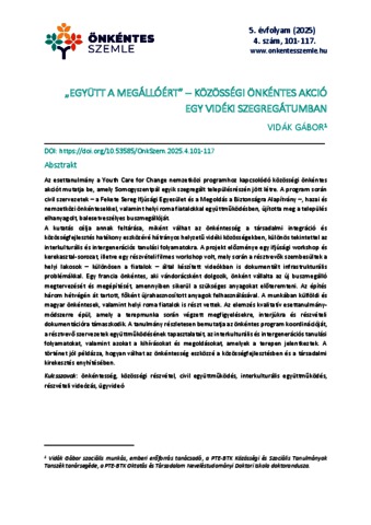 Az esettanulmány a Youth Care for Change nemzetközi programhoz kapcsolódó közösségi önkéntes akciót mutatja be, amely Somogyszentpál egyik szegregált településrészén jött létre. A program során civil szervezetek – a Fekete Sereg Ifjúsági Egyesület és a Megoldás a Biztonságra Alapítvány –, hazai és nemzetközi önkéntesekkel, valamint helyi roma fiatalokkal együttműködésben, újította meg a település elhanyagolt, balesetveszélyes buszmegállóját. A kutatás célja annak feltárása, miként válhat az önkéntesség a társadalmi integráció és közösségfejlesztés hatékony eszközévé hátrányos helyzetű vidéki közösségekben, különös tekintettel az interkulturális és intergenerációs tanulási folyamatokra. A projekt előzménye egy ifjúsági workshop és kerekasztal-sorozat, illetve egy részvételi filmes workshop volt, mely során a résztvevők szembesültek a helyi lakosok – különösen a fiatalok – által készített videókban is dokumentált infrastrukturális problémákkal. Egy francia önkéntes, aki vándorácsként dolgozik, önként vállalta az új buszmegálló megtervezését és megépítését, amennyiben sikerül a szükséges anyagokat előteremteni. Az építés három hétvégén át tartott, főként újrahasznosított anyagok felhasználásával. A munkában külföldi és magyar önkéntesek, valamint helyi roma fiatalok is részt vettek. Az elemzés kvalitatív esettanulmány-módszerre épül, amely a terepmunka során végzett megfigyelésekre, interjúkra és részvételi dokumentációra támaszkodik. A tanulmány részletesen bemutatja az önkéntes program koordinációját, a résztvevő szervezetek együttműködésének tapasztalatait, az interkulturális és intergenerációs tanulási folyamatokat, valamint azokat a kihívásokat és megoldásokat, amelyek a terepen jelentkeztek. A történet jól példázza, hogyan válhat az önkéntesség eszközzé a közösségfejlesztésben és a társadalmi kirekesztés enyhítésében. | The case study presents a community volunteer action carried out in connection with the international Youth Care for Change program, implemented in a segregated neighborhood of Somogyszentpál, Hungary. During the project, civil organizations — the Fekete Sereg Youth Association and the Megoldás a Biztonságra Foundation — collaborated with domestic and international volunteers as well as local Roma youth to renovate the village’s neglected and hazardous bus stop. The aim of the study is to explore how volunteering can serve as an effective tool for social integration and community development in disadvantaged rural areas, with special attention to intercultural and intergenerational learning processes. The project was preceded by a series of youth workshops and roundtable discussions, as well as a Participatory Video workshop, during which participants confronted the infrastructural problems of the area, documented in videos made by young local residents. A volunteer from France, who works as a traveling carpenter, offered to design and build a new bus stop, provided that the necessary materials were provided. Construction took place over three weekends, mainly using recycled materials. Both international and Hungarian volunteers, together with local Roma youth, participated in the work. The analysis applies a qualitative case study approach, drawing on field observations, semi-structured interviews, and participatory documentation. The study provides a detailed account of the coordination of the volunteer program, the experiences of cooperation between the participating organizations, and the intercultural and intergenerational learning processes. It also discusses the challenges and solutions that emerged in the field. The story exemplifies how volunteering can become an effective tool for community development and for mitigating social exclusion.