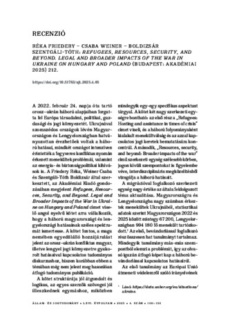 Ferencz, Orsolya Zita (2025) Réka Friedery – Csaba Weiner – Boldizsár Szentgáli-Tóth: Refugees, Resources, Security, and Beyond. Legal and Broader Impacts of the War in Ukraine on Hungary and Poland (Budapest: Akadémiai Kiadó 2025) 212. ÁLLAM- ÉS JOGTUDOMÁNY, 66 (4). pp. 106-109. ISSN 0002-564X