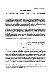 A református oktatás számára mindig is fontos volt a tehetséges diákok segítése, támogatása. A támogatás azonban nem merülhet ki a képességeik gyarapításának segítésében. A tehetséges gyermekek lelkére való figyelem, annak ápolása és gondozása nem maradhat el. A tehetséges gyermekkel foglalkozó lelkigondozónak az a feladata, hogy a lelki nehézségekben támogassa a gyermekeket, melyhez első számú iránymutatója Isten igéje. Ezen kívül szükséges lenne, hogy a gyermek szüleivel és pedagógusaival folyamatos párbeszéd alakuljon ki. | A tehetséges gyermekek lelkigondozása (Pastoral care for gifted children). Helping and supporting gifted students has always been important in Reformed education. However, support cannot be limited to helping them develop their abilities. Attention must also be paid to the spiritual wellbeing of gifted children, which must be nurtured and cared for. The task of the spiritual care provider working with gifted children is to support them in their spiritual difficulties, guided first and foremost by the word of God. In addition, it is necessary to establish ongoing dialogue with the children’s parents and teachers.