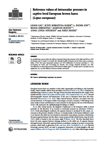 Gál, János and Sebesztha-Kojer, Judit and Sós, Endre and Sebesztha, Bence and Hoitsy, Márton György and Nógrádi, Anna and Ziszisz, Árisz (2025) Reference values of intraocular pressure in captive bred European brown hares (Lepus europaeus). ACTA VETERINARIA HUNGARICA, 73 (4). pp. 207-211. ISSN 0236-6290