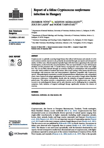 Tóth, Zsombor Tamás and Márialigeti, Márton and Lajos, Zoltán and Tarpataki, Noémi (2025) Report of a feline Cryptococcus neoformans infection in Hungary. ACTA VETERINARIA HUNGARICA, 73 (4). pp. 237-242. ISSN 0236-6290