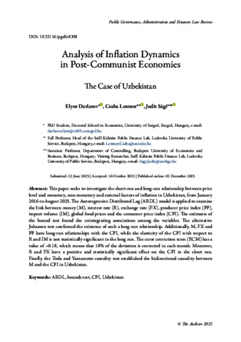 Davlatov, Elyor and Lentner, Csaba and Sági, Judit (2025) Analysis of Inflation Dynamics in Post-Communist Economies : The Case of Uzbekistan. PUBLIC GOVERNANCE ADMINISTRATION AND FINANCES LAW REVIEW, 10 (2). pp. 1-22. ISSN 2498-6275