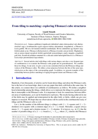 Németh, László (2025) From tiling to matching: exploring Fibonacci cube structures. DIMENZIÓK : MATEMATIKAI KÖZLEMÉNYEK (13). pp. 55-62. ISSN 2064-2172