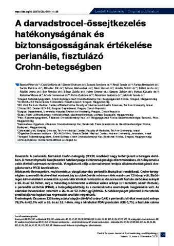 Molnár, Tamás and Bacsur, Péter and Csák, Stefánia and Daniel, Saham and Zuzana, Serclova and Resál, Tamás and Farkas, Bernadett and Sarlós, Patrícia and Miheller, Pál and Nitsan, Maharshak and Meir, Zemel and Ariella, Shitrit and Bálint, Anita and Fábián, Anna and Bor, Renáta and Bősze, Zsófia and Ivány, Emese and Szepes, Zoltán and Farkas, Klaudia and Katerina, Vlkova and Aneta, Tremerova and Petra, Zuskova and Ábrahám, Szabolcs (2025) A darvadstrocel-őssejtkezelés hatékonyságának és biztonságosságának értékelése perianális, fisztulázó Crohn-betegségben. CENTRAL EUROPEAN JOURNAL OF GASTROENTEROLOGY AND HEPATOLOGY = GASZTROENTEROLÓGIAI ÉS HEPATOLÓGIAI SZEMLE, 11 (4). pp. 135-144. ISSN 2415-9107