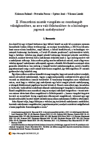 Kelemen, Roland and Petruska, Ferenc and Spitzer, Jenő and Vikman, László (2024) Nemzetközi minták vizsgálata az összehangolt válságkezelésre, az arra való felkészülésre és a különleges jogrendi szabályozásra. In: A védelmi és biztonsági szabályozás magyarországi reformja. Ludovika Egyetemi Kiadó, Budapest, pp. 43-105. ISBN 9789636531171; 9789636531188; 9789636531195