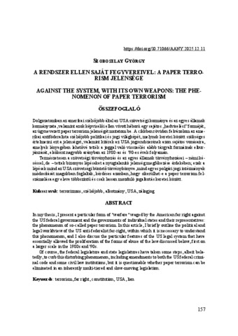 Dolgozatomban az amerikai szélsőjobb által az USA szövetségi kormánya és az egyes államok kormányzata, valamint azok képviselői ellen vívott háború egy sajátos „hadviselési” formáját, az úgynevezett paper terrorism jelenségét mutatom be. A cikkben röviden felvázolom az amerikai antiföderalista szélsőjobb politikai és jogi világképét, melynek keretei között szükséges értelmezni ezt a jelenséget, valamint kitérek az USA jogrendszerének azon sajátos vonásaira, amelyek lényegében lehetővé tették a joggal való visszaélés alább tárgyalt formáinak elburjánzását, elsőként nagyobb arányban az 1980-as és ’90-es évek folyamán. Természetesen a szövetségi törvényhozás és az egyes államok törvényhozásai – némi késéssel, de – tettek bizonyos lépéseket a nyugtalanító jelenség megfékezése érdekében; ezek a lépések mind az USA szövetségi büntető törvénykönyve, mind egyes polgári jogi intézmények módosítását magukban foglalták, kérdéses azonban, hogy sikerülhet-e a paper terrorism felszámolása egy eleve többszintű és csak lassan mozduló jogalkotás keretei között. | In my thesis, I present a particular form of "warfare" waged by the American far right against the US federal government and the governments of individual states and their representatives: the phenomenon of so-called paper terrorism. In this article, I briefly outline the political and legal worldview of the US anti-federalist far-right, within which it is necessary to understand this phenomenon, and I also discuss the particular features of the US legal system that have essentially allowed the proliferation of the forms of abuse of the law discussed below, first on a larger scale in the 1980s and '90s. Of course, the federal legislature and state legislatures have taken some steps, albeit belatedly, to curb this disturbing phenomenon, including amendments to both the US federal criminal code and some civil law institutions, but it is questionable whether paper terrorism can be eliminated in an inherently multi-tiered and slow-moving legislation.