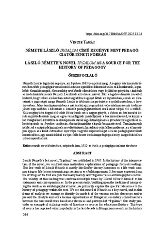 Vincze, Tamás András (2025) Németh László Irgalom című regénye mint pedagógiatörténeti forrás = László Németh’s novel Irgalom as a source for the history of pedagogy. In: Multidiszciplináris kutatások és elemzések a Nyíregyházi Egyetemen. Acta Academiae Nyiregyhaziensis (12.). Nyíregyházi Egyetem, Nyíregyháza, pp. 244-260. ISBN 9786156032799