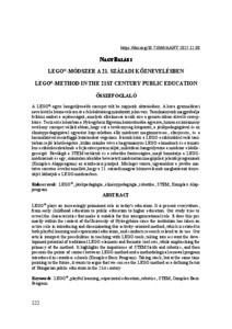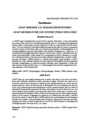 A LEGO®-egyre hangsúlyosabb szerepet tölt be napjaink oktatásában. A kora gyermekkori neveléstől a köznevelésen át a felsőoktatásig mindenütt jelen van. Tanulmányunk megpróbálja feltárni azokat a sajátosságait, amelyek alkalmassá teszik erre a generációkon átívelő szerepkörre. Teszi ezt elsősorban a Nyíregyházi Egyetem kontextusába ágyazva, hiszen az intézmény tevékeny szerepet vállalt abban, hogy ezt a tevékenység-központú, a játékpedagógiával és az élménypedagógiával egyaránt kapcsolatban álló módszert megismertesse, elterjessze, és a használatával összefüggő kutatásokat végezzen. Írásunk kitér a LEGO-eszközökkel való tanításban rejlő lehetőségekre, külön számba véve a hagyományos LEGO-elemeknek és a tematikus eszközkészleteknek a fejlesztési potenciálját, miközben hangsúlyozza a módszer elsődlegességét. Rávilágít a STEM területek és a robotika fontosságára, majd bemutatja a LEGOmódszernek és egy, számtalan iskolába bevezetett módszertani megújulást jelentő programnak (Komplex Alapprogram) az érintkezési pontjait. Mérleget vonva, ugyanakkor a jövőbe mutatva szeretne érvelni amellett, hogy a 21. századi magyar köznevelésnek meghatározó tényezőjét láthatjuk a LEGO-módszerben. ABSTRACT LEGO® plays an increasingly prominent role in today's education. It is present everywhere, from early childhood education to public education to higher education. Our study tries to reveal the characteristics that make it suitable for this intergenerational role. It does this primarily within the context of theUniversity of Nyíregyháza since the institution has taken an active role in introducing and disseminating this activity-oriented method, which is related to both playful learning and experiential education, and conducts research related to its use. Our article interpret the possibilities in teaching with LEGO-tools, taking into account the development potential of traditional LEGO-elements and thematic tool sets, while emphasizing the primacy of the method. It highlights the importance of STEM fields and robotics, and then presents the points of contact between LEGO-method and a methodological renewal program introduced in countless schools (Komplex Basic Program). Taking stock, but at the same time pointing to the future, it wants to argue that we can see the LEGO-method as a defining factor of Hungarian public education in the 21st century.