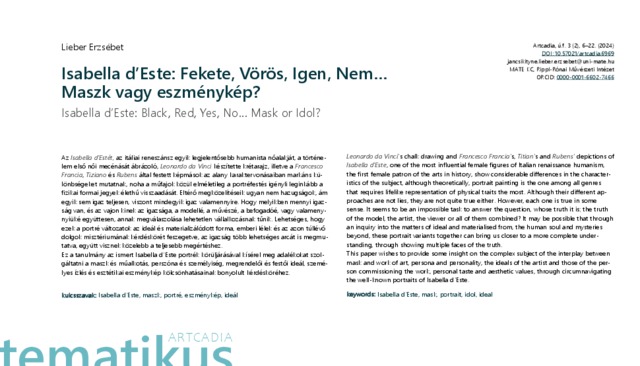 Jancsikityné Lieber, Erzsébet (2024) Isabella d’Este: Fekete, Vörös, Igen, Nem… Maszk vagy eszménykép? ARTCADIA: A KAPOSVÁRI EGYETEM MŰVÉSZETI FŐISKOLAI KAR MŰVÉSZETI ÉS TUDOMÁNYOS KÖZLEMÉNYEI, úf. 3 (2). pp. 6-22. ISSN 2060-3266