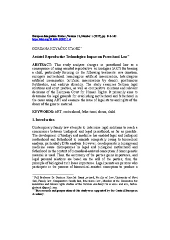 Gordana, Kovaček Stanić (2025) Assisted Reproductive Technologies: Impact on Parenthood Law. EUROPEAN INTEGRATION STUDIES, 21 (1). pp. 141-162. ISSN 1588-6735