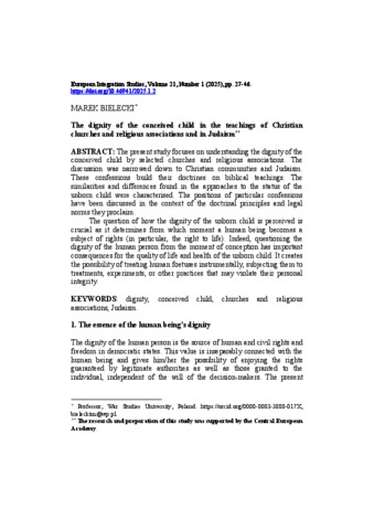 Bielecki, Marek (2025) The dignity of the conceived child in the teachings of Christian churches and religious associations and in Judaism. EUROPEAN INTEGRATION STUDIES, 21 (1). pp. 27-46. ISSN 1588-6735