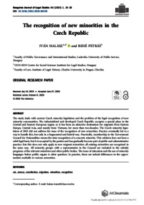 The study deals with current Czech minority legislation and the problem of the legal recognition of new minority communities. The industrialized and developed Czech Republic occupies a special place in the Central and Eastern European region, as it has been an attractive destination for migrants from Eastern Europe, Central Asia, and mainly from Vietnam, for more than two decades. The Czech minority legis- lation of 2001 did not address the issue of the recognition of new minorities. Practice eventually led to a way to handle this, but only in a fragmented and hybrid way. Practically, membership in the Government Council for Nationalities means the state recognition of a concrete minority. This solution does not have a solid legal basis, but it is accepted by the parties and has gradually become part of public and administrative practice. But this does not only apply to new migrant minorities: all existing minorities are recognized in the same way. All minority groups with a representative in the Council are included in the subsidy programs of the relevant ministries and other public bodies. The issue of education and the use of minority languages before public organs is other question. In practice, there are indeed differences in the oppor- tunities available to various minorities.