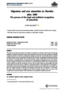 The paper first describes the situation of minorities and migration in Slovakia and then deals with the legal regulation of national and ethnic minorities, with a special focus on the process of the recognition of officially recognised minorities. In Slovakia, constitutional regulation and the law taxonomically named recognised national minorities only in the socialist period between 1960 and 1990. The granting of official minority status has otherwise been mostly implicit. The post-1992 situation is further complicated by the fact that Slovakia does not have a comprehensive law on minorities that would regulate the recognition process in some form. Formal recognition is therefore de facto achieved by a community being invited to join a National Minority Council created by the Slovak Government. However, this no longer confers any special rights other than representation, because this process is linked to community numbers or other legal aspects. The situation is most similar to that in the Czech Republic, except that the Czechs have had a minority law since 2004. So far, three new migrant minorities in Slovakia have managed to obtain this type of recognition – the Russians, the Serbs, and the Vietnamese. Recognition of the Moravian minority is unique and is due more to the complicated Czech-Slovak relations of the 1990s than to any significant migration processes.