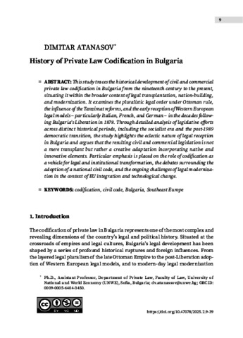 This study traces the historical development of civil and commercial private law codification in Bulgaria from the nineteenth century to the present, situating it within the broader context of legal transplantation, nation-building, and modernization. It examines the pluralistic legal order under Ottoman rule, the influence of the Tanzimat reforms, and the early reception of Western European legal models—particularly Italian, French, and German—in the decades following Bulgaria’s Liberation in 1878. Through detailed analysis of legislative efforts across distinct historical periods, including the socialist era and the post-1989 democratic transition, the study highlights the eclectic nature of legal reception in Bulgaria and argues that the resulting civil and commercial legislation is not a mere transplant but rather a creative adaptation incorporating native and innovative elements. Particular emphasis is placed on the role of codification as a vehicle for legal and institutional transformation, the debates surrounding the adoption of a national civil code, and the ongoing challenges of legal modernization in the context of EU integration and technological change.