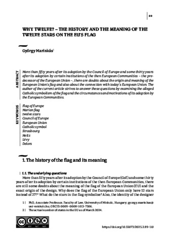 Marinkás, György (2025) Why Twelve? – The History and the Meaning of the Twelve Stars on the EU’s Flag. LAW IDENTITY AND VALUES, 5 (2). pp. 89-110. ISSN 2786-2542