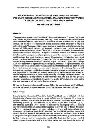 Saeed, Ahlam Nassar Omar (2024) Role and Impact of World Bank Structural Adjustment Programs in Developing Countries: Analyzing the Effectiveness of SAPs in the Middle East: the Case of Jordan. HUMÁN INNOVÁCIÓS SZEMLE, 15 (1). pp. 162-185. ISSN 2062-0292