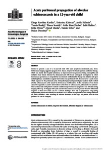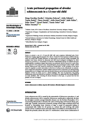 Kardics, Kinga and Kalocsai, Krisztina and Kálmán, Attila and Benkő, Tamás and Seszták, Tímea and Szabó, Attila and Halász, Judit and Orosz, Erika and Danka, József and Sréter, Tamás and Dezsényi, Balázs (2025) Acute peritoneal propagation of alveolar echinococcosis in a 12-year-old child. ACTA MICROBIOLOGICA ET IMMUNOLOGICA HUNGARICA, 72 (3). pp. 280-286. ISSN 1217-8950