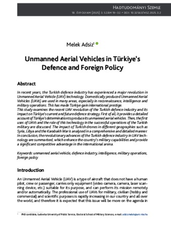 Melek, Adsiz (2025) Unmanned Aerial Vehicles in Türkiye’s Defence and Foreign Policy. HADTUDOMÁNYI SZEMLE, 18 (3). pp. 19-32. ISSN 2676-9816