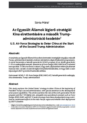 Sánta, Mária (2025) Az Egyesült Államok légierő-stratégiái Kína elrettentésére a második Trump-adminisztráció kezdetén = U.S. Air Force Strategies to Deter China at the Start of the Second Trump Administration. HADTUDOMÁNYI SZEMLE, 18 (3). pp. 169-187. ISSN 2676-9816