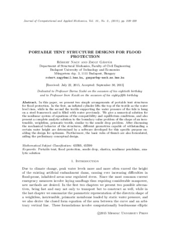 Nagy, Róbert and Gáspár, Zsolt (2015) Portable tent structure designs for flood protection. JOURNAL OF COMPUTATIONAL AND APPLIED MECHANICS, 10 (2). pp. 209-229. ISSN 1586-2070