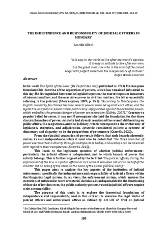 In his work The Spirit of the Laws (De l'esprit des lois), published in 1748, Montesquieu formulated his doctrine of the separation of powers, which has remained influential to this day. He distinguished between the legislative power, the executive power in matters of international law, and the executive power in civil law matters, the latter essentially referring to the judiciary (Montesquieu, 1899, p. 151). “According to Montesquieu, the English monarchy functioned because several powers were set against each other, and the legislative and judicial powers were particularly safeguarded against the executive power, which embodies the greatest danger of power concentration (Csűrös, 2007).” Contrary to popular belief, however, it was not Montesquieu who laid the foundation for the three classical branches of power; Aristotle had already mentioned the council deliberating on public affairs, the magistrates, and the judiciary, which correspond to the trichotomy of legislation, execution, and adjudication. Aristotle considered politeia–a mixture of democracy and oligarchy–to be the proper form of governance (Cservák, 2022). From the classical separation of powers, it follows that each branch inherently carries its own independence, while it must also be noted that “the three branches of power exercise their authority through multiple state bodies, and overlaps can be observed with regard to their competences (Cservák, 2015). This leads to the legitimate question of whether judicial enforcement–particularly the judicial officer–is independent, and to which branch of power this activity belongs. This is further supported by the fact that “the judicial officer, during the enforcement of the law, is a public official or civil servant who does not act on behalf of the creditor but on behalf of the state, in the name of the public (Sőréné, 2023).” This paper aims to analyze the key aspects of the institution of judicial enforcement, specifically the independence and responsibility of judicial officers within the Hungarian legal system. In my view, the enforcement system, which ensures the execution of enforceable court or notarial decisions, is indispensable for the functioning of the rule of law; however, the public authority powers vested in judicial officers require strict accountability. The purpose of this study is to explore the theoretical foundations of independence and responsibility, and in this context, to examine the legal status of judicial officers and enforcement offices as defined by Act LIII of 1994 on Judicial Enforcement, taking their system of accountability as a reference point. The paper also investigates the relationship between the appointment and remuneration system of judicial officers, highlighting the potential impacts of performance-based compensation on independence. Furthermore, it analyzes the types and mechanisms of civil, criminal, and disciplinary liability of judicial officers, with particular regard to mandatory liability insurance, crimes of abuse of office and corruption, as well as the role of disciplinary courts.