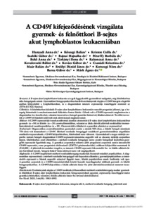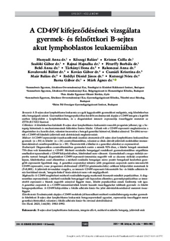Hunyadi, Anna and Kőszegi, Balázs and Kriston, Csilla and Szalóki, Gábor and Rajnai, Hajnalka and Péterffy, Borbála and Bekő, Anna and Tárkányi, Ilona and Rakonczai, Anna and Kovalovszki, Bálint and Kovács, Gábor and Csanádi, Krisztina and Maár, Balázs and Erdélyi, Dániel János and Kutszegi, Nóra and Barna, Gábor and Márk, Ágnes (2025) A CD49f kifejeződésének vizsgálata gyermek- és felnőttkori B-sejtes akut lymphoblastos leukaemiában = Investigation of CD49f expression in childhood and adult B-cell acute lymphoblastic leukemia. ORVOSI HETILAP, 166 (50). pp. 1983-1992. ISSN 0030-6002
