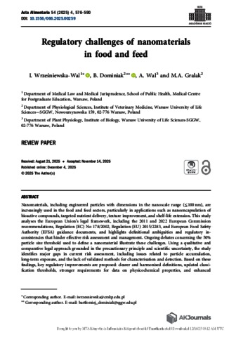 Wrześniewska-Wal, I. and Dominiak, B. and Wal, A. and Gralak, M.A. (2025) Regulatory challenges of nanomaterials in food and feed. ACTA ALIMENTARIA: AN INTERNATIONAL JOURNAL OF FOOD SCIENCE, 54 (4). pp. 576-590. ISSN 0139-3006
